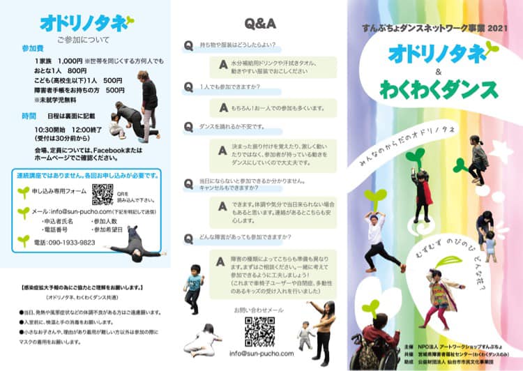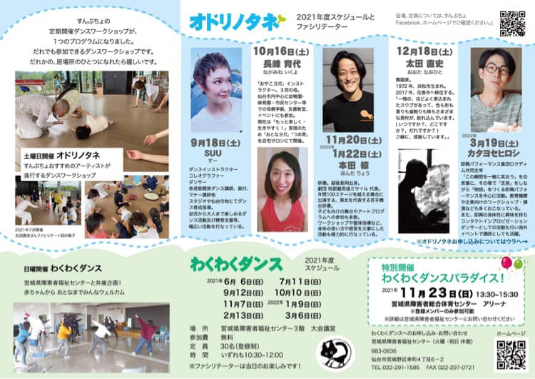 定期開催のすんぷちょダンスワークショップ「オドリノタネ 」と宮城県障害者福祉センターの依頼で続けてきたわくわくダンスは、ダンスネットワーク事業として今年度も継続中です。わくわくダンスはセンターとすんぷちょの共催となりました。