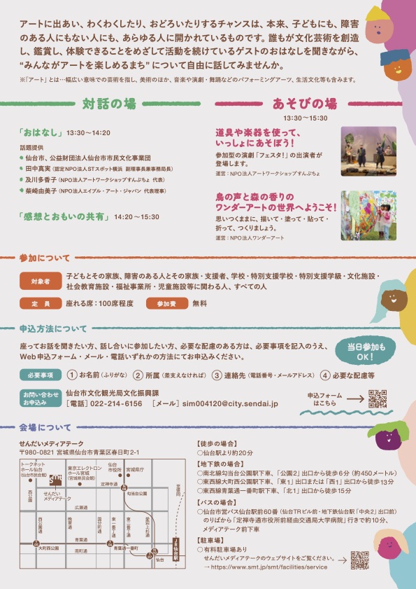 1.氏名(ふりがな) 2.所属(差支えなければ) 3.申込者の電話番号またはメールアドレス 4.必要な配慮等 - 申込先(仙台市文化観光局文化振興課)