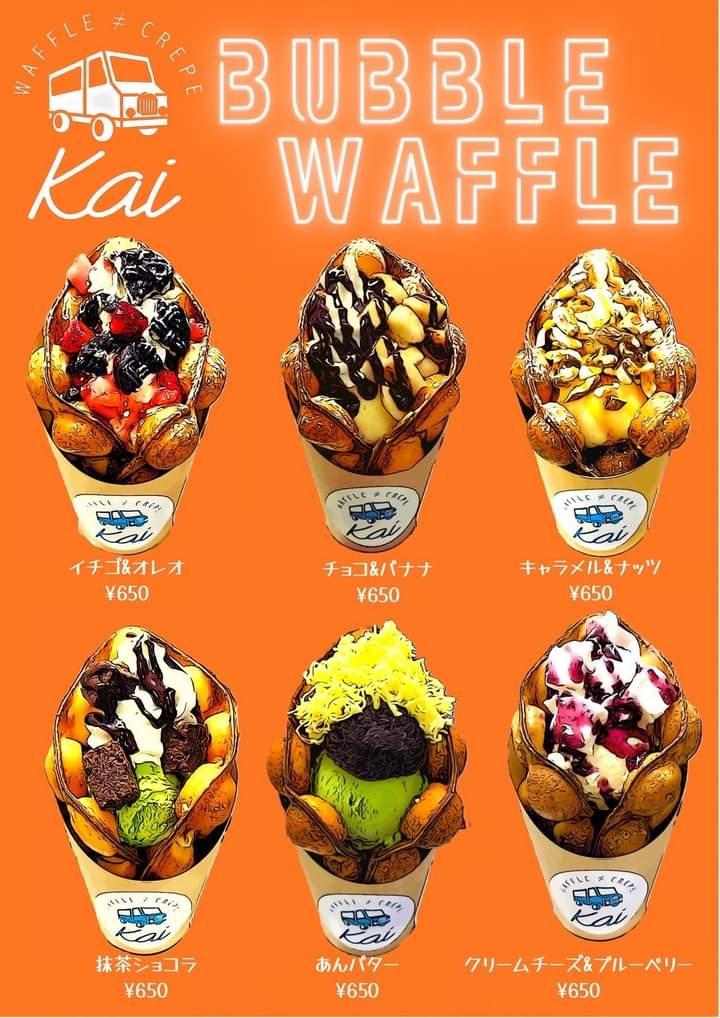 ・バブルワッフルKai (米粉100%バブルワッフル(いちごオレオ、チョコバナナ、キャラメルナッツ、抹茶ショコラ、あんバター、クリームチーズブルーベリー、限定メニュー)