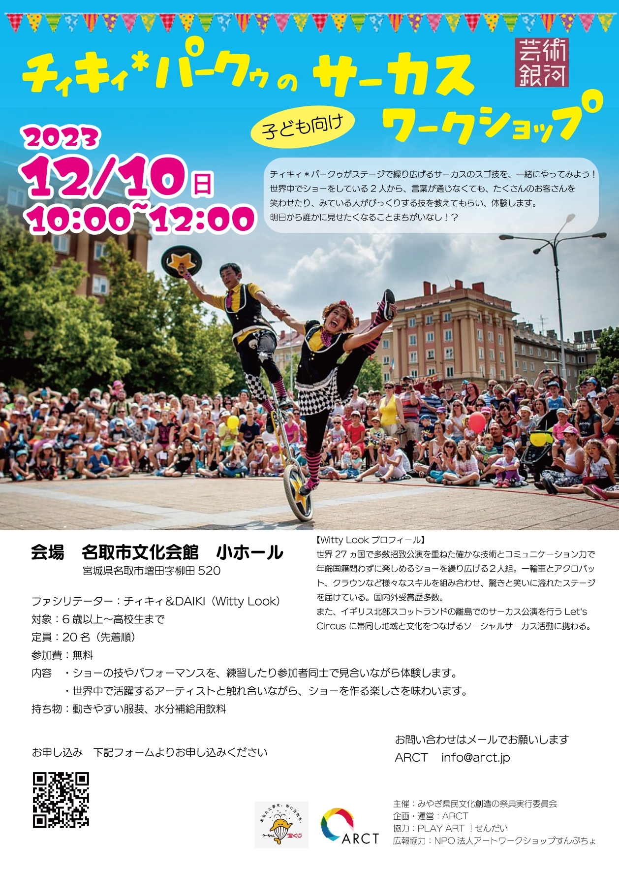 フラットシアターフェスティバルで素晴らしいショーを上演してくれたチィキィパークゥの2人が、再び宮城県にやってきます!すんぷちょは下記のワークショップに広報協力として関わっています。ぜひこの機会に2人のスゴ技を体験してみよう!