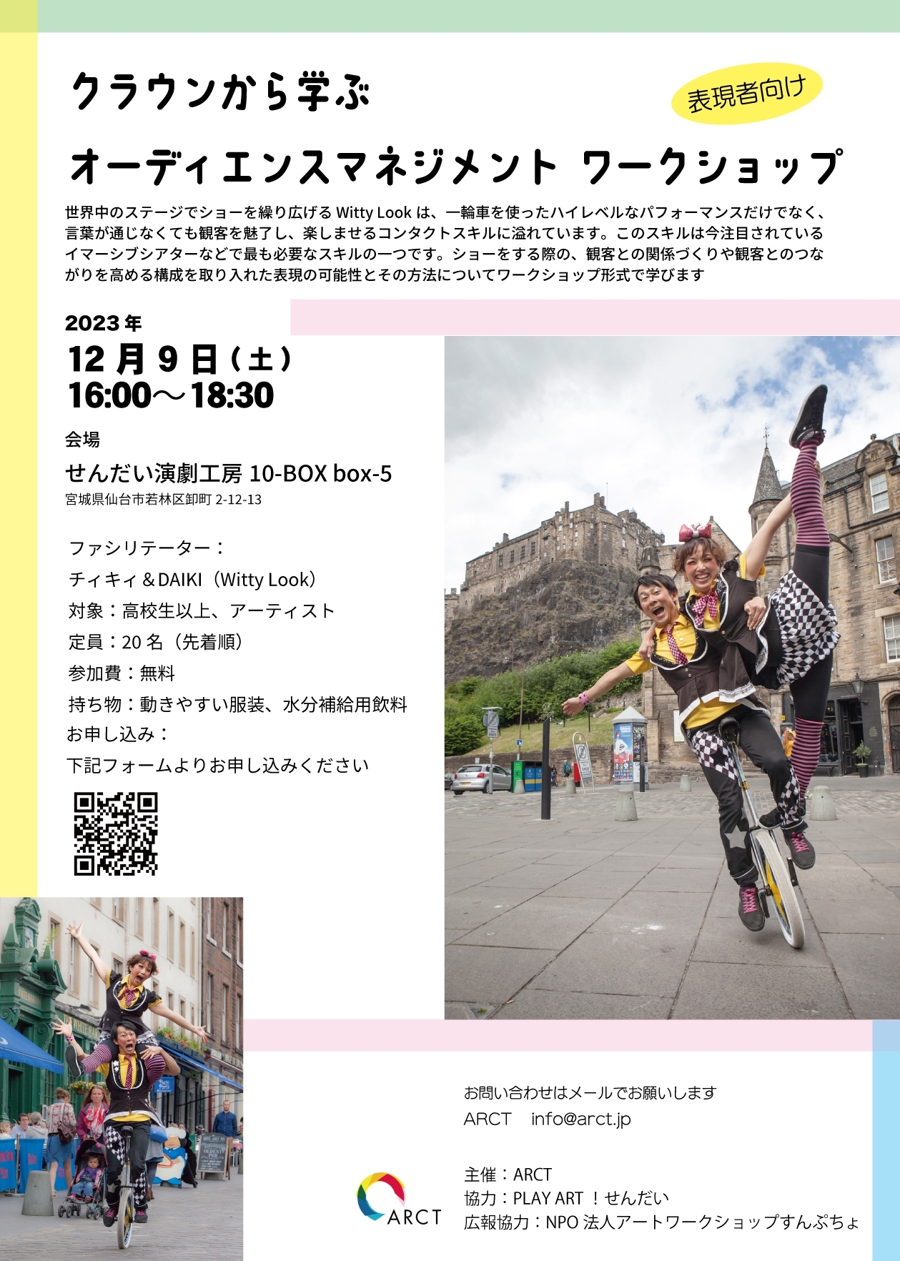 世界中のステージでショーを繰り広げる Witty Lookは、一輪車を使ったハイレベルなパフォーマンスだけでなく、言葉が通じなくても観客を魅了し、楽しませるコンタクトスキルに溢れています。このスキルは今注目されているイマーシブシアターなどで最も必要なスキルの一つです。ショーをする際の、観客との関係づくりや観客とのつながりを高める構成を取り入れた表現の可能性とその方法についてワークショップ形式で学びます。